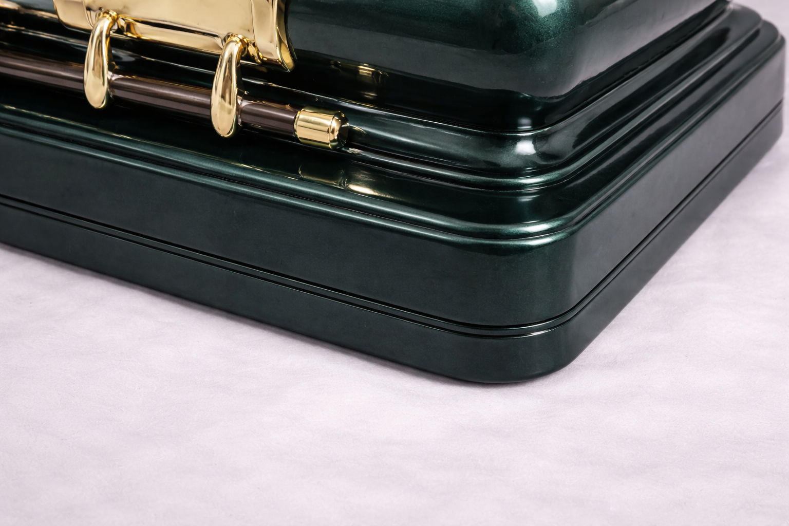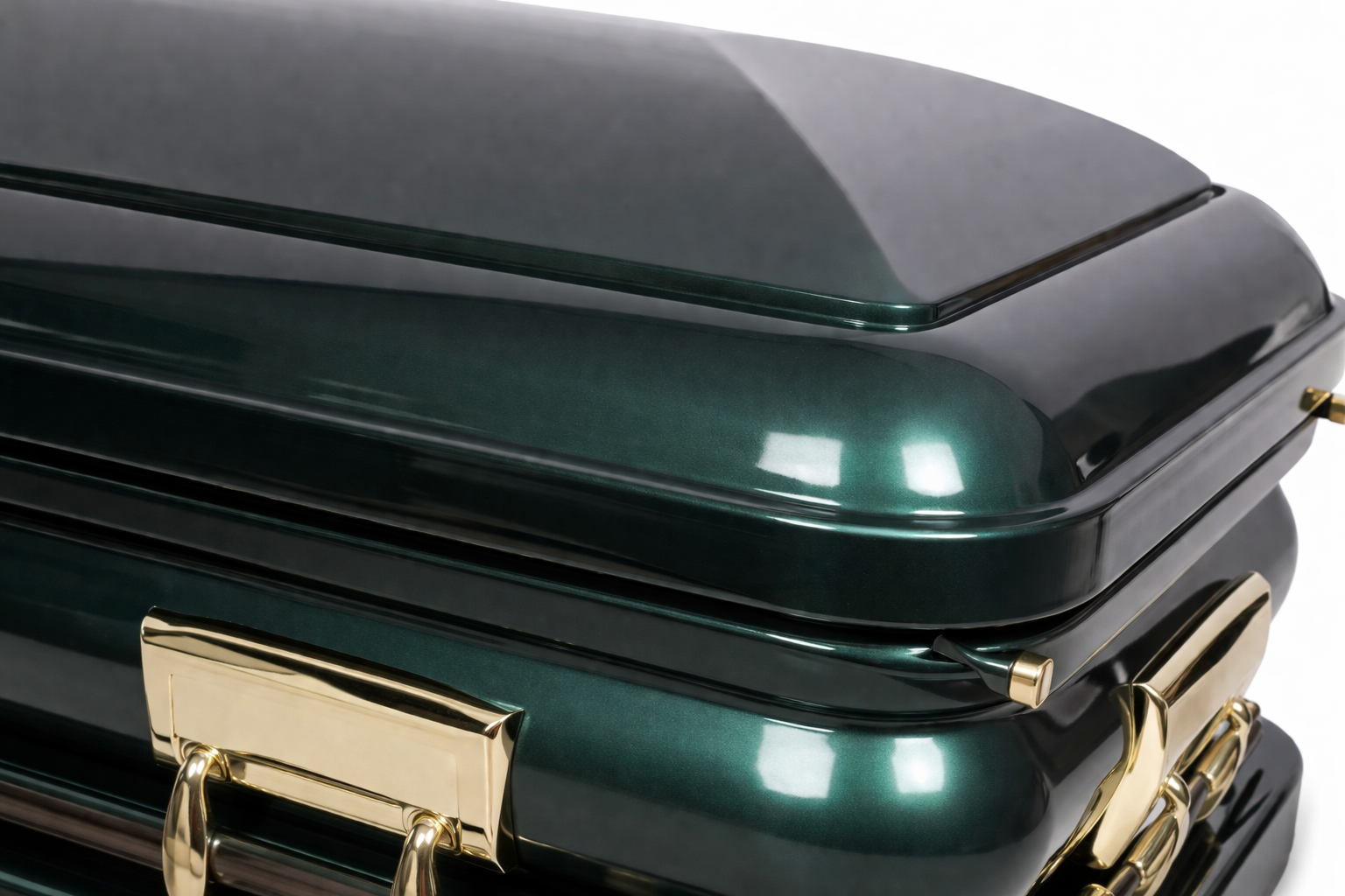 This premium 18-gauge steel casket is designed for families in Australia seeking a dignified, elegant and respectful farewell. Finished in a deep hunter green high-gloss exterior, it offers a calm, refined and timeless appearance that stands apart from standard black, silver or plain market caskets.