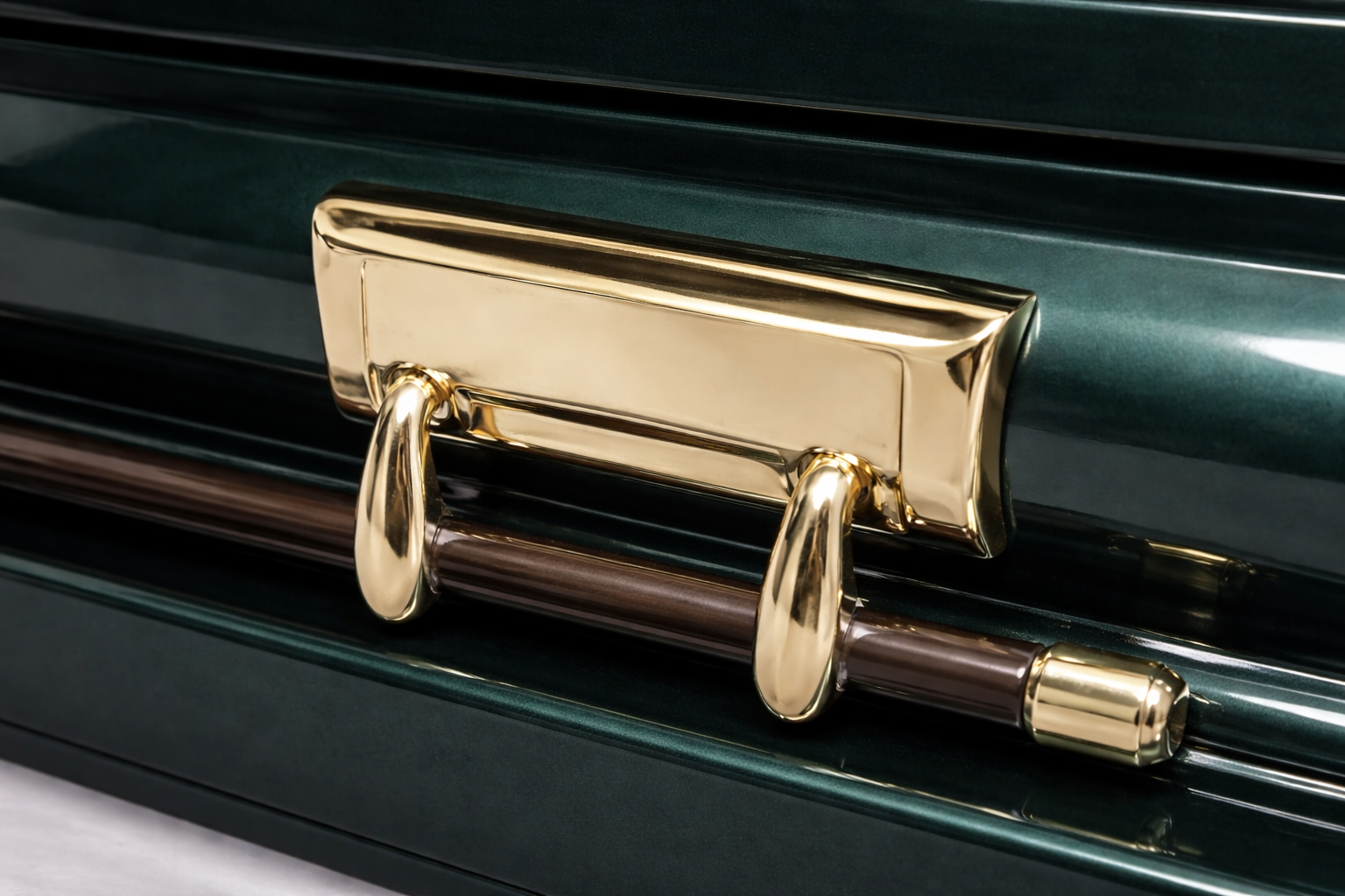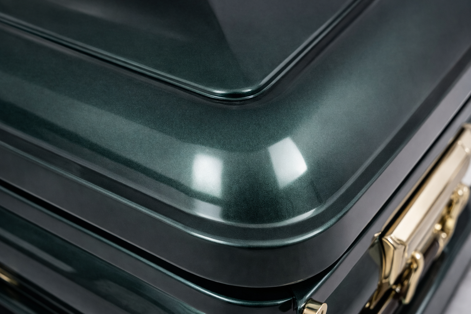 Crafted from durable 18-gauge steel, this funeral casket provides a strong and reliable structure with a more substantial feel than many lighter-gauge alternatives. The rich hunter green finish creates a peaceful and distinguished look, while the polished gold-tone hardware adds a warm luxury contrast against the deep green body.