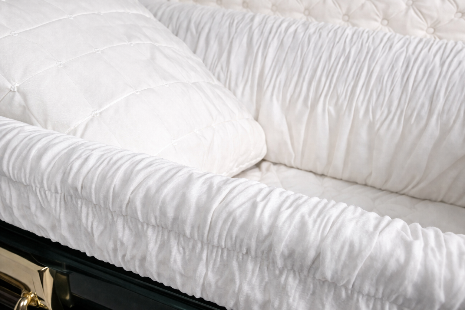 The interior features a soft white velvet lining with a padded pillow and elegant quilted presentation, creating a gentle, clean and respectful setting for funeral viewings, memorial services and final farewell ceremonies.